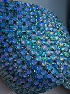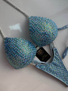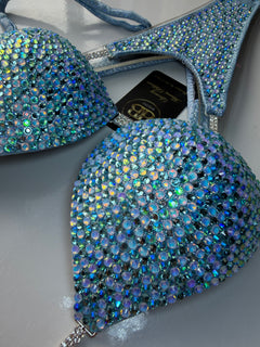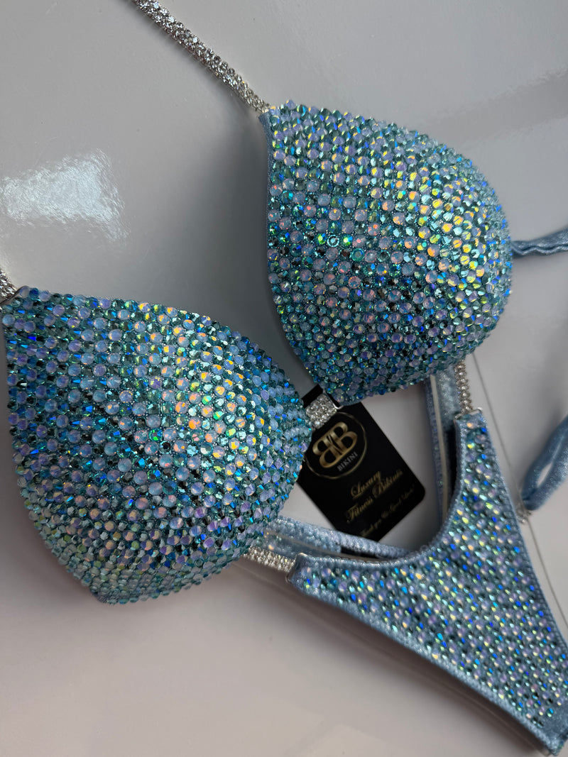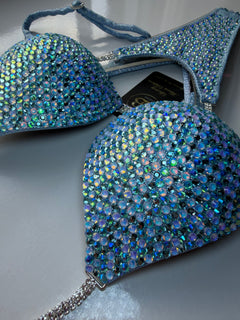 Original frozen light blue NPC or PCA style bikini. Mix of AB aquamarine and AB light opal Czech crystals on metallic blue lycra with 2 row 16 ss connectors. Moulded bra cup with pushups on side and also can be padded if needed.