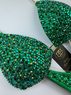 Stunning and refreshing green mix of zircon green, emerald green and AB green Czech crystals on dazzle green lycra with 2 row 16 ss connectors. Moulded bra cup with pushups on side and also can be padded if needed.