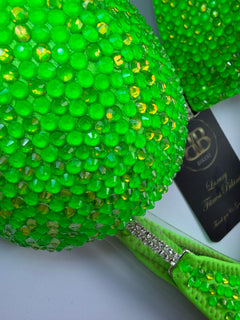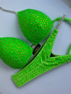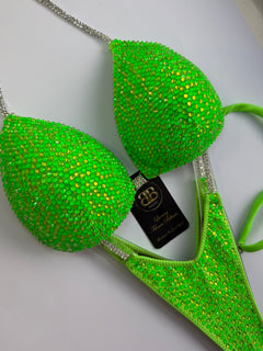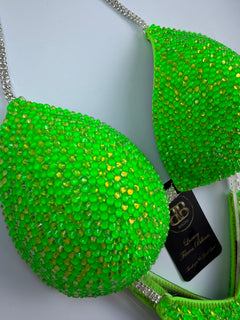 Neon green mix of Czech crystals on neon green lycra with 2 row 16 ss silver connectors. Moulded bra cup with no pushups on side and also can be padded if needed.