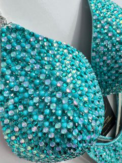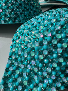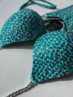 Brand new design on the market! Unique and stunning combination of tiffany blue mocca crystals with transparent, blue zircon and opal pink shimmer turquoise crystals on turquoise lycra with 1 row 28 ss connectors. Bra cup also can be padded and has push up moulded cup