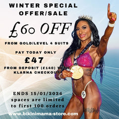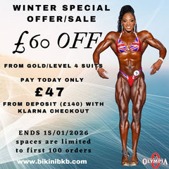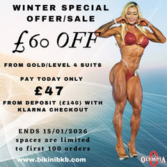 Sign up now and take advantage of our exclusive early bird offer! Secure your spot today with deposit as low as £140 (KLARNA payment plan available) and you’ll receive a FREE £60 voucher towards your order from fully crystallised GOLD/LEVEL 4 bikini or figure, wellness competition suit.